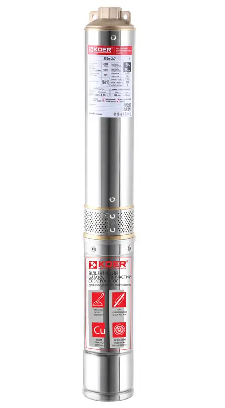 Насос свердловин. Центробой. З ПУЛЬТОМ KOER 4SDM 2/7 (Н=50М, Q=3, 3M3, P=250 ВТ, КАБЕЛЬ 1М, 1М, 1М, 1)